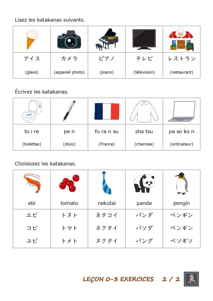 Tu peux trouver les fiches encore dans « Télécharger les fiches » sous le nom « Exercice Katakana ».